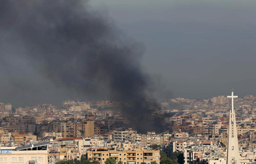 9月28日,在黎巴嫩首都貝魯特南郊,以軍空襲現(xiàn)場(chǎng)濃煙滾滾。新華社發(fā)(比拉爾·賈維希攝)