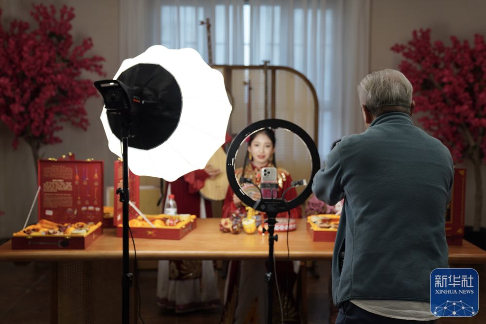 10月15日,與會嘉賓在阿克蘇地區(qū)新和縣加依村龜茲文化樂器展示中心觀看工作人員直播。 新華社記者 劉夢琪 攝
