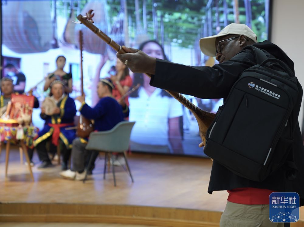 10月15日,與會嘉賓在阿克蘇地區(qū)新和縣加依村加依手工樂器產(chǎn)業(yè)園體驗傳統(tǒng)樂器。 新華社記者 劉夢琪 攝