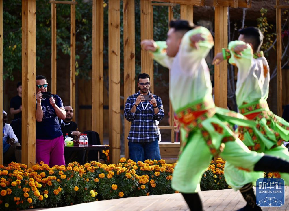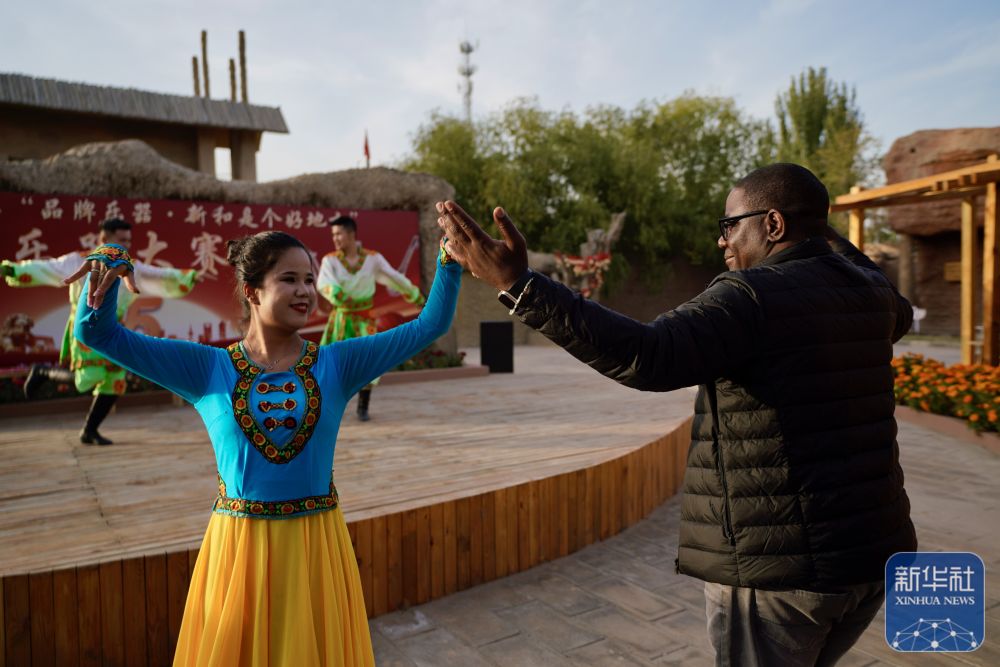10月15日,與會嘉賓在伊寧市喀贊其民俗旅游區(qū)與表演者互動。 新華社記者 牟宇 攝