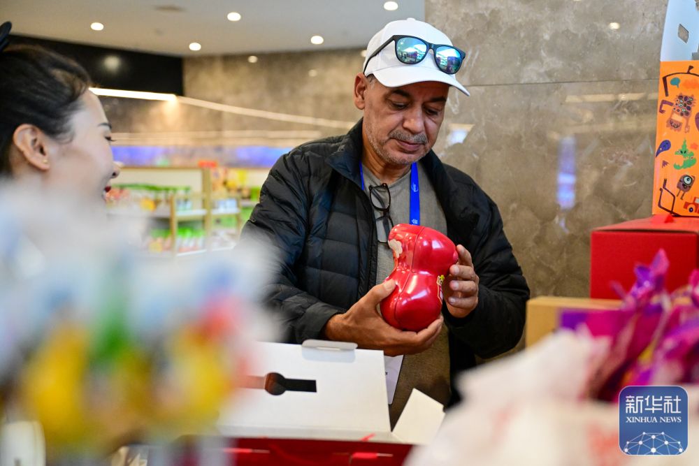 10月15日,與會嘉賓在新疆喀什跨境電商進出口商品展示交易中心購買紀念品。 新華社記者 丁磊 攝