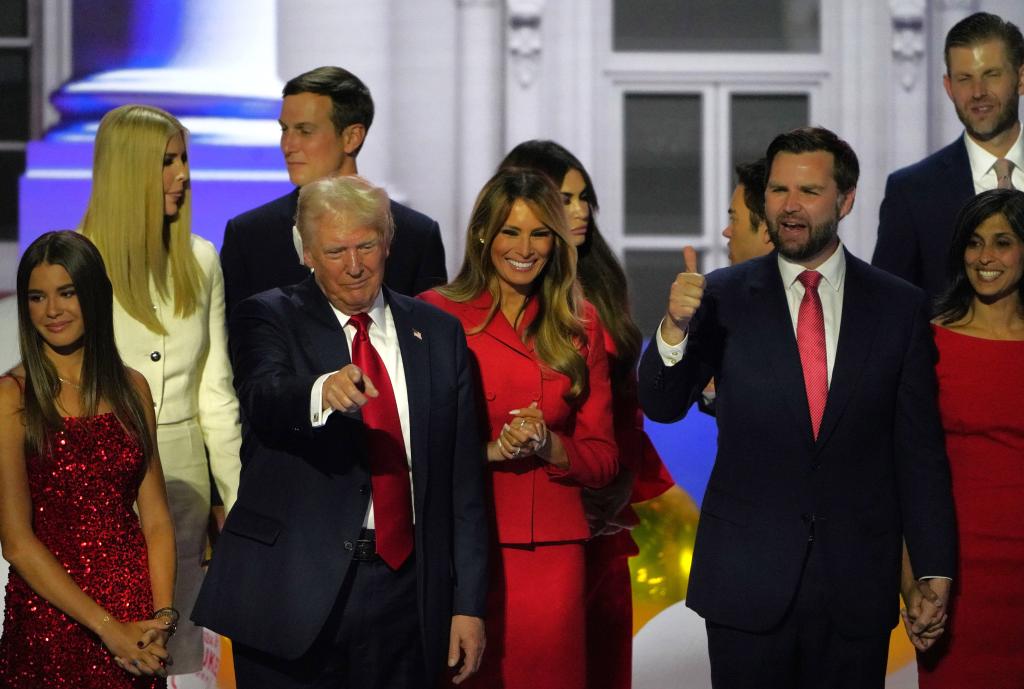 7月18日,美國(guó)前總統(tǒng)特朗普(前排左二)和共和黨副總統(tǒng)候選人萬(wàn)斯(前排右二)在共和黨全國(guó)代表大會(huì)上向觀眾致意。新華社記者 吳曉凌 攝
