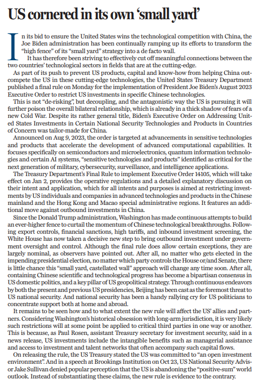 一直以來(lái),美國(guó)竭力切斷中美兩國(guó)在尖端科技方面的聯(lián)系。為防止美國(guó)產(chǎn)品、資本和技術(shù)幫助中國(guó)在尖端科技領(lǐng)域超越美國(guó),美國(guó)財(cái)政部于本周一發(fā)布最終規(guī)則,以落實(shí)總統(tǒng)拜登于2023年8月份簽署的第14105號(hào)行政命令《關(guān)于美國(guó)在受到關(guān)切的國(guó)家投資于特定的國(guó)家安全技術(shù)和產(chǎn)品的問(wèn)題》。該行政命令意在推動(dòng)敏感技術(shù)及產(chǎn)品進(jìn)步,加速先進(jìn)計(jì)算能力發(fā)展,特別關(guān)注半導(dǎo)體和微電子、量子信息技術(shù)和特定人工智能系統(tǒng),以及被認(rèn)定為對(duì)下一代軍事、網(wǎng)絡(luò)安全、監(jiān)視及情報(bào)應(yīng)用至關(guān)重要的“敏感技術(shù)和產(chǎn)品”。第14105號(hào)行政令涉及限制美國(guó)在部分技術(shù)領(lǐng)域的對(duì)華投資。盡管用詞模糊,但也不難看出,該行政令是為中國(guó)“量身定制”。