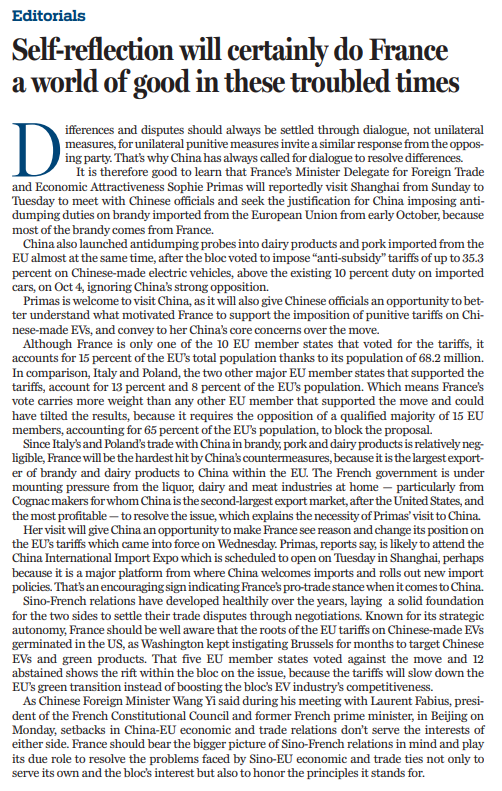 歐盟投票表決時(shí),法國支持對(duì)中國電動(dòng)汽車加征懲罰性關(guān)稅。普里馬斯此次訪華,將讓中方進(jìn)一步了解法國的動(dòng)機(jī),同時(shí)傳達(dá)中方關(guān)切。