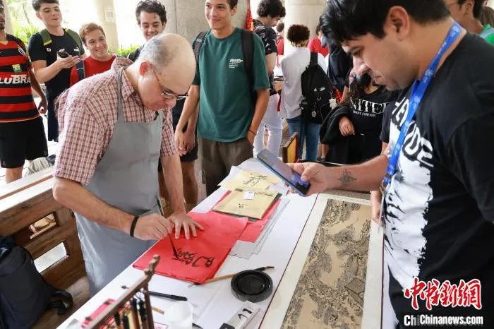 出于對武術(shù)的熱愛,他開始鉆研與中國有關(guān)的一切。但他真正接觸中華文化是在結(jié)識巴西當(dāng)?shù)氐娜A人家庭之后。當(dāng)時,他經(jīng)常前往華人開設(shè)的商店尋找漢字描摹。一位店主目睹了他“作畫”一般的寫字過程后大吃一驚,于是開始教授他漢字筆畫與筆順,一來二去,他與店主一家和社區(qū)的其他華人家庭結(jié)下深厚友誼。
