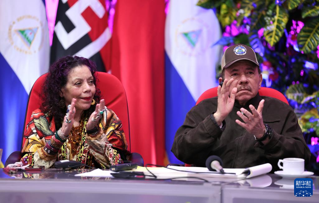 11月18日,在尼加拉瓜馬那瓜,尼加拉瓜總統(tǒng)奧爾特加(右)出席第十七屆中國—拉美企業(yè)家高峰會活動。新華社發(fā)(尼加拉瓜政府供圖)