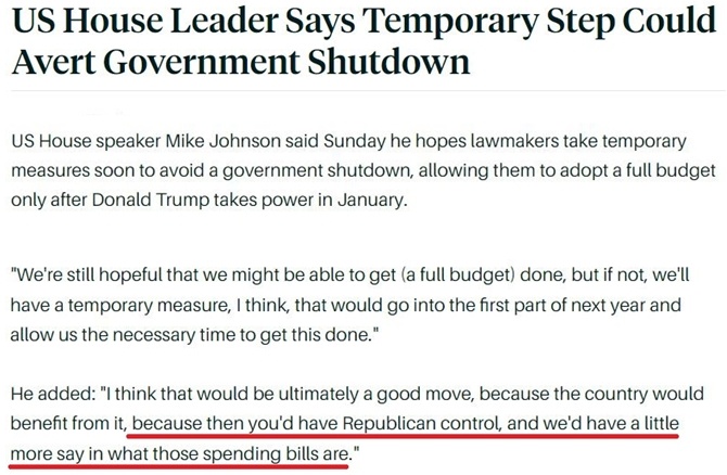 根據(jù)約翰遜的想法,國會(huì)應(yīng)通過一個(gè)“能生效至明年上半年”的短期撥款法案,以確保特朗普明年1月就任總統(tǒng)后,共和黨人能有充足的時(shí)間來按照自己的政策意愿通過完整的年度預(yù)算案。