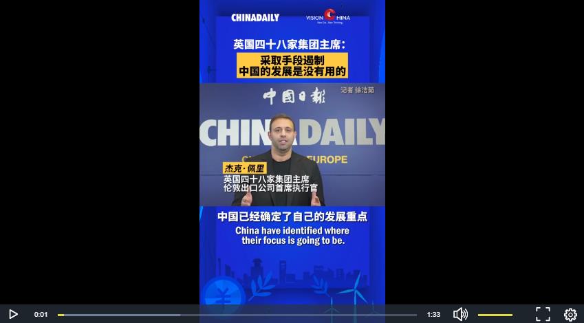 12月5日,由中國(guó)日?qǐng)?bào)社主辦、對(duì)外經(jīng)濟(jì)貿(mào)易大學(xué)協(xié)辦的“新時(shí)代大講堂”活動(dòng)在北京舉行。英國(guó)四十八家集團(tuán)主席、倫敦出口公司CEO杰克·佩里在視頻演講中提到“對(duì)中國(guó)發(fā)展采取遏制手段是沒(méi)有用的”,他說(shuō)“中國(guó)的各種活動(dòng)和博覽會(huì)邀請(qǐng)了所有人,沒(méi)有誰(shuí)會(huì)被中國(guó)拒之門(mén)外”。