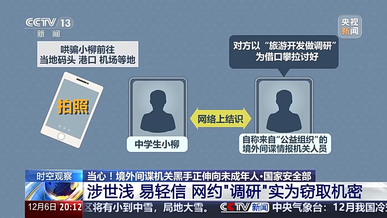中學(xué)生小柳在網(wǎng)絡(luò)上結(jié)識(shí)了一名自稱(chēng)來(lái)自“公益組織”的境外間諜情報(bào)機(jī)關(guān)人員,對(duì)方以“旅游開(kāi)發(fā)做調(diào)研”為借口攀拉討好,哄騙小柳前往當(dāng)?shù)卮a頭、港口、機(jī)場(chǎng)等地拍照,逐步發(fā)展至收集有關(guān)重要軍事設(shè)施地點(diǎn)的照片和相關(guān)信息,小柳還因此收取了“酬勞”數(shù)千元。涉世未深的小柳在沒(méi)有意識(shí)到問(wèn)題嚴(yán)重性的情況下輕易相信了對(duì)方,沒(méi)想到自己的行為已經(jīng)對(duì)我國(guó)軍事安全和國(guó)家安全構(gòu)成了嚴(yán)重威脅。