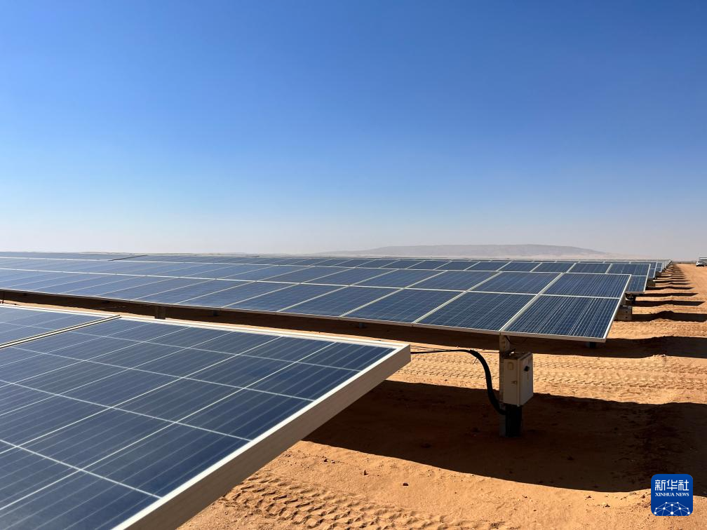 這是11月24日在埃及南部阿斯旺省的沙漠中拍攝的本班光伏產(chǎn)業(yè)園內(nèi)的光伏板。新華社記者 隋先凱 攝