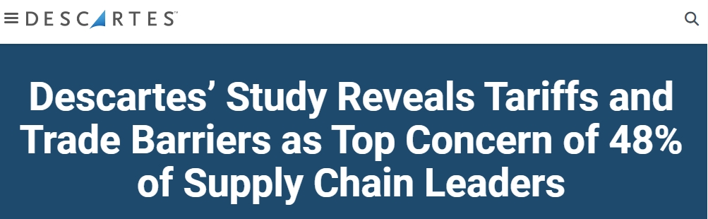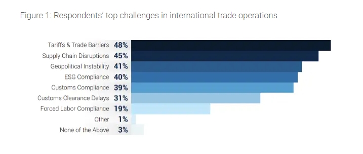 調(diào)查顯示,48%的受訪者認為關(guān)稅和貿(mào)易壁壘上升是他們最擔(dān)心的問題,緊隨其后的是供應(yīng)鏈中斷(45%)和地緣政治不穩(wěn)定(41%)。此外,無論所在公司規(guī)模大小,受訪者都將關(guān)稅和貿(mào)易壁壘列為當(dāng)前面臨的首要問題。這項報告共調(diào)查了978名來自歐洲、北美、南美和亞太地區(qū)主要貿(mào)易國的供應(yīng)鏈領(lǐng)域領(lǐng)導(dǎo)者。