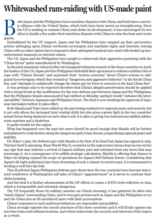 這一不明智的日菲防務(wù)協(xié)定表明,這兩個(gè)國家已經(jīng)盲目聽信美國編造的所謂中國“咄咄逼人”的論調(diào),并以此為借口為其攫取權(quán)益的行為開脫。