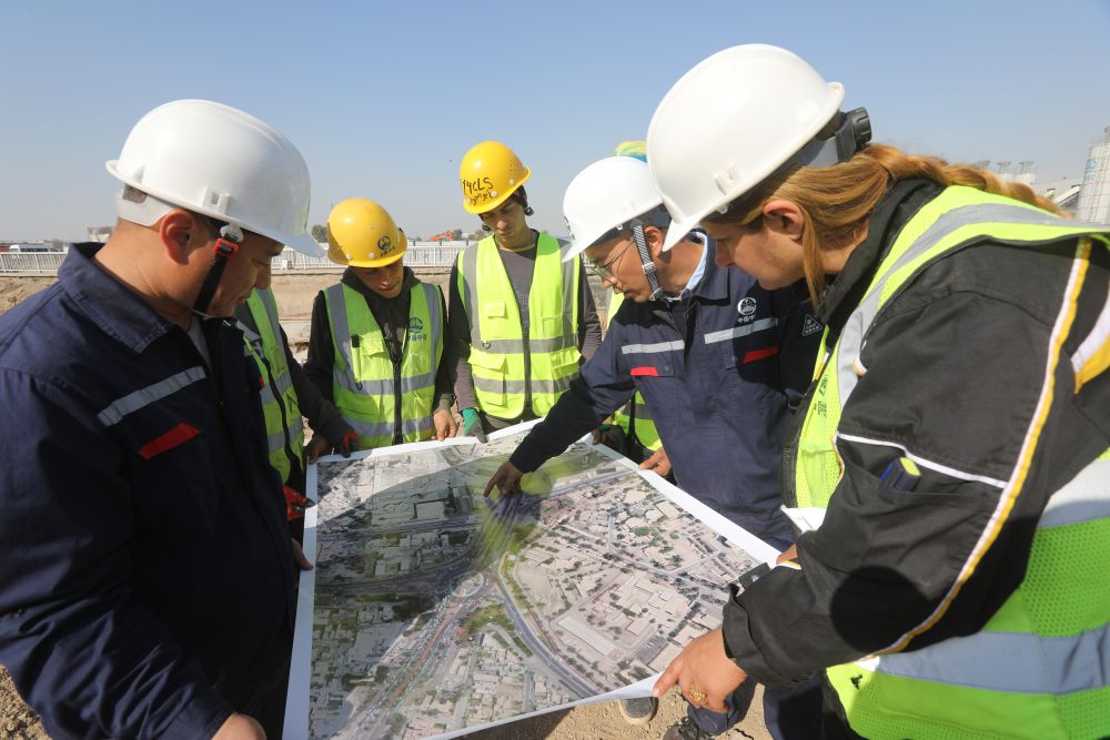 2024年3月2日,中伊員工在伊拉克巴格達尼蘇爾立體交通樞紐項目現(xiàn)場討論施工進展。新華社發(fā)(哈利勒·達伍德攝)