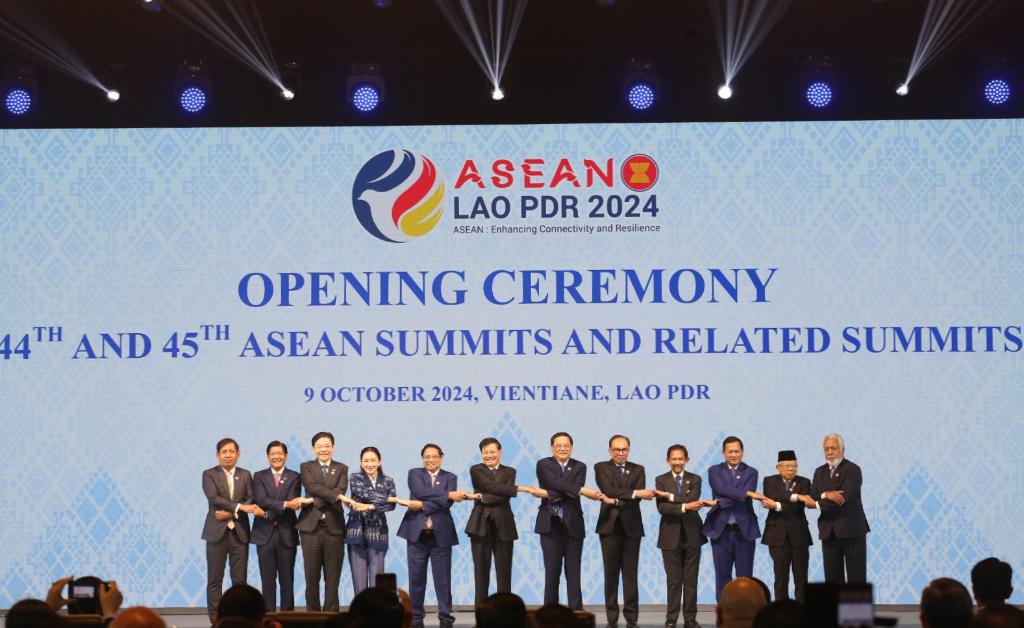 這是10月9日在老撾首都萬(wàn)象拍攝的第44屆和第45屆東盟峰會(huì)開(kāi)幕式現(xiàn)場(chǎng)。新華社發(fā)