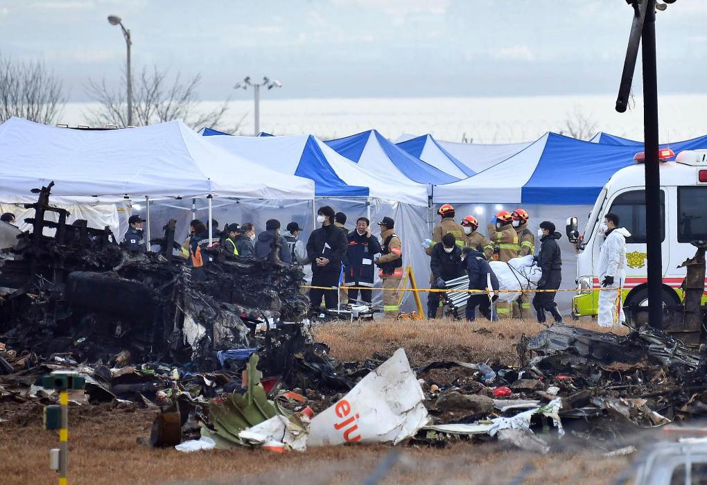 12月30日,調(diào)查人員在韓國(guó)務(wù)安飛機(jī)失事現(xiàn)場(chǎng)工作。新華社發(fā)(全休相攝)