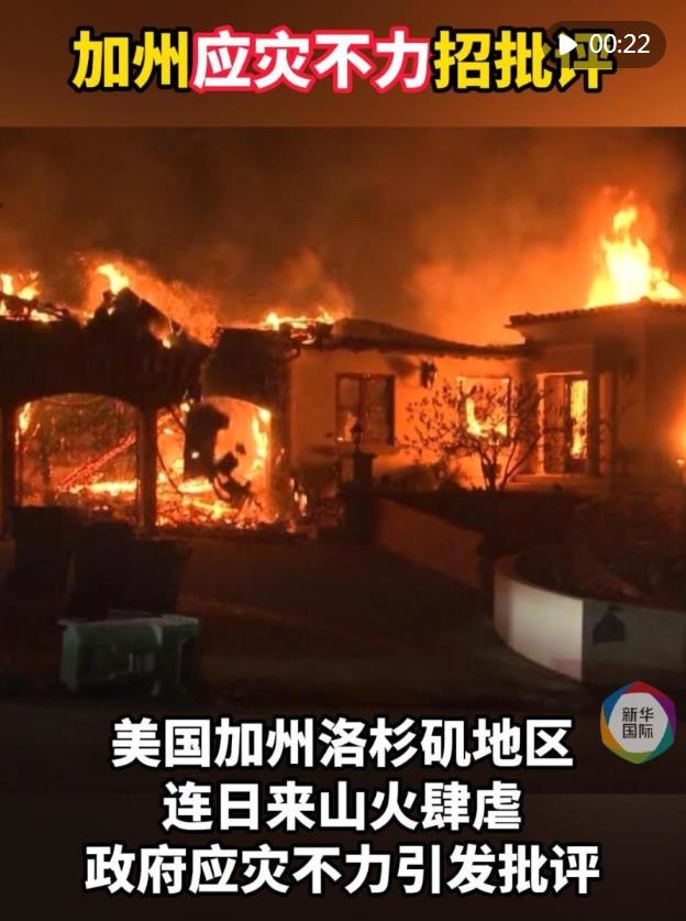 美國加利福尼亞州洛杉磯地區(qū)連日來山火肆虐,截至11日已造成16人死亡,至少13人失蹤,上萬棟房屋被燒毀。州及地方政府應(yīng)災不力引發(fā)批評。