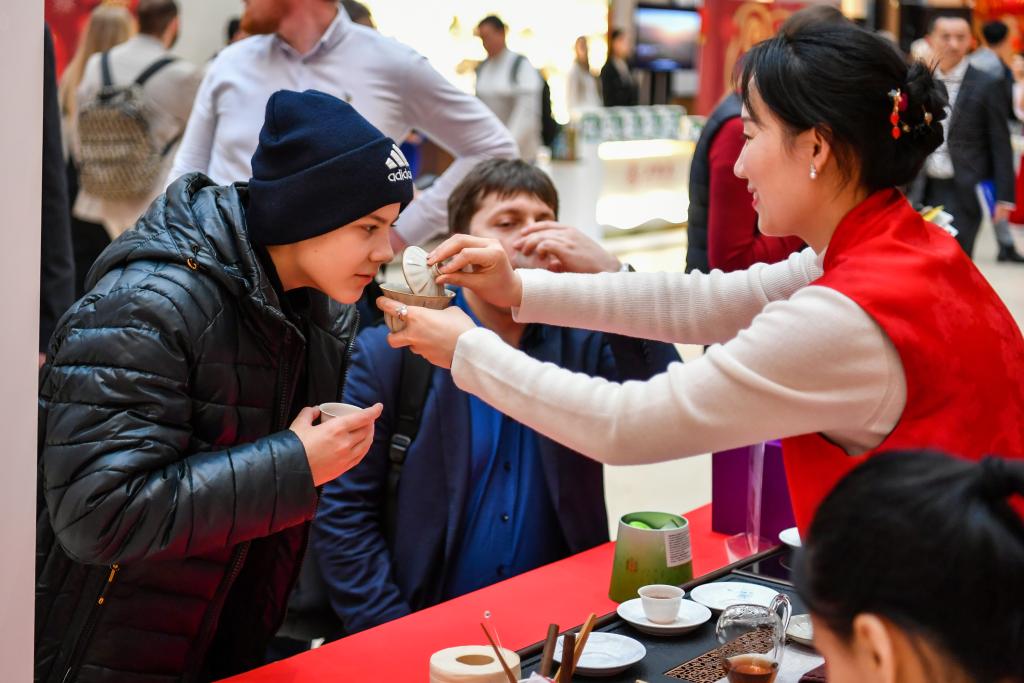 2025年1月28日,在俄羅斯莫斯科舉行的新春廟會(huì)活動(dòng)上,游客在感受茶文化。新華社記者曹陽攝