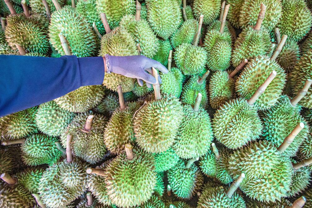 2024年4月26日,在泰國尖竹汶府,工人在榴蓮園碼放榴蓮。新華社記者王騰攝