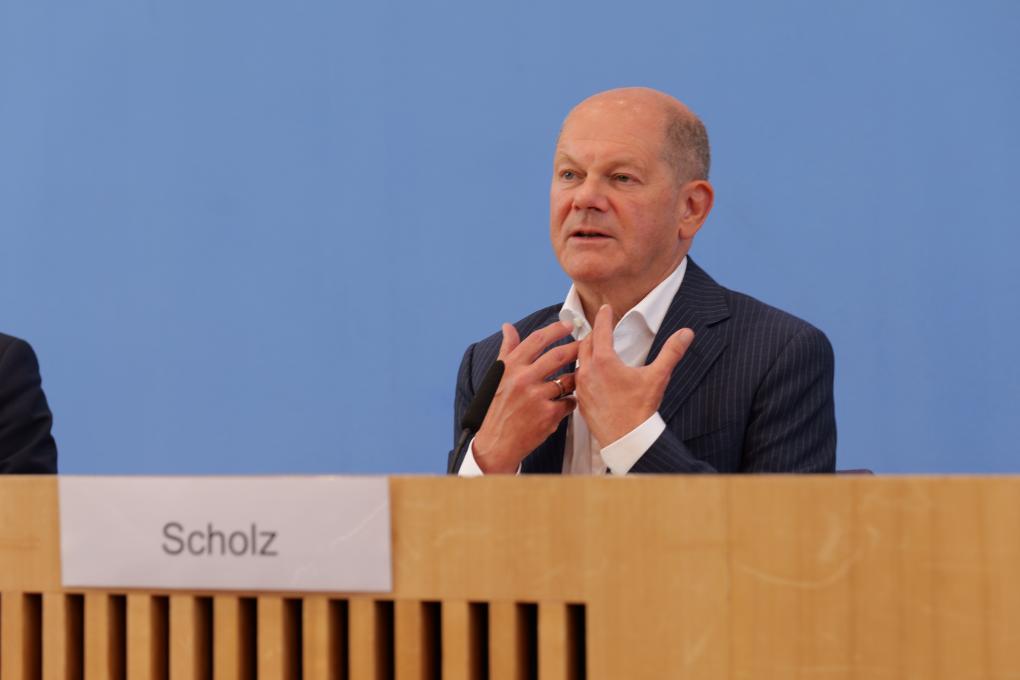 2024年7月24日,德國總理朔爾茨在柏林舉行的新聞發(fā)布會上講話。新華社記者李函林攝