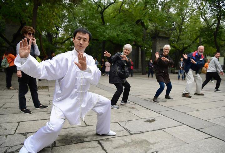 這是西安“80后”小伙趙慶(前)在小雁塔景區(qū)內(nèi)向外國游客教授楊氏太極拳動作。新華社記者邵瑞攝