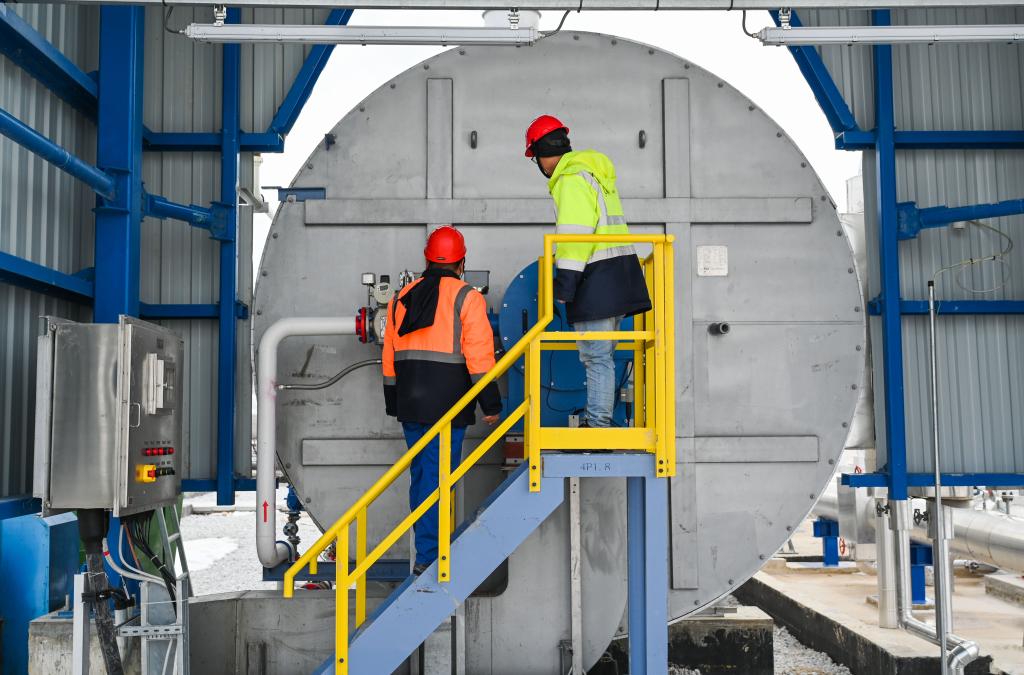 2月12日,中國工作人員在土耳其阿克薩拉伊省的圖茲湖地下天然氣儲庫擴(kuò)建項(xiàng)目地面場站查看設(shè)備。新華社記者劉磊攝