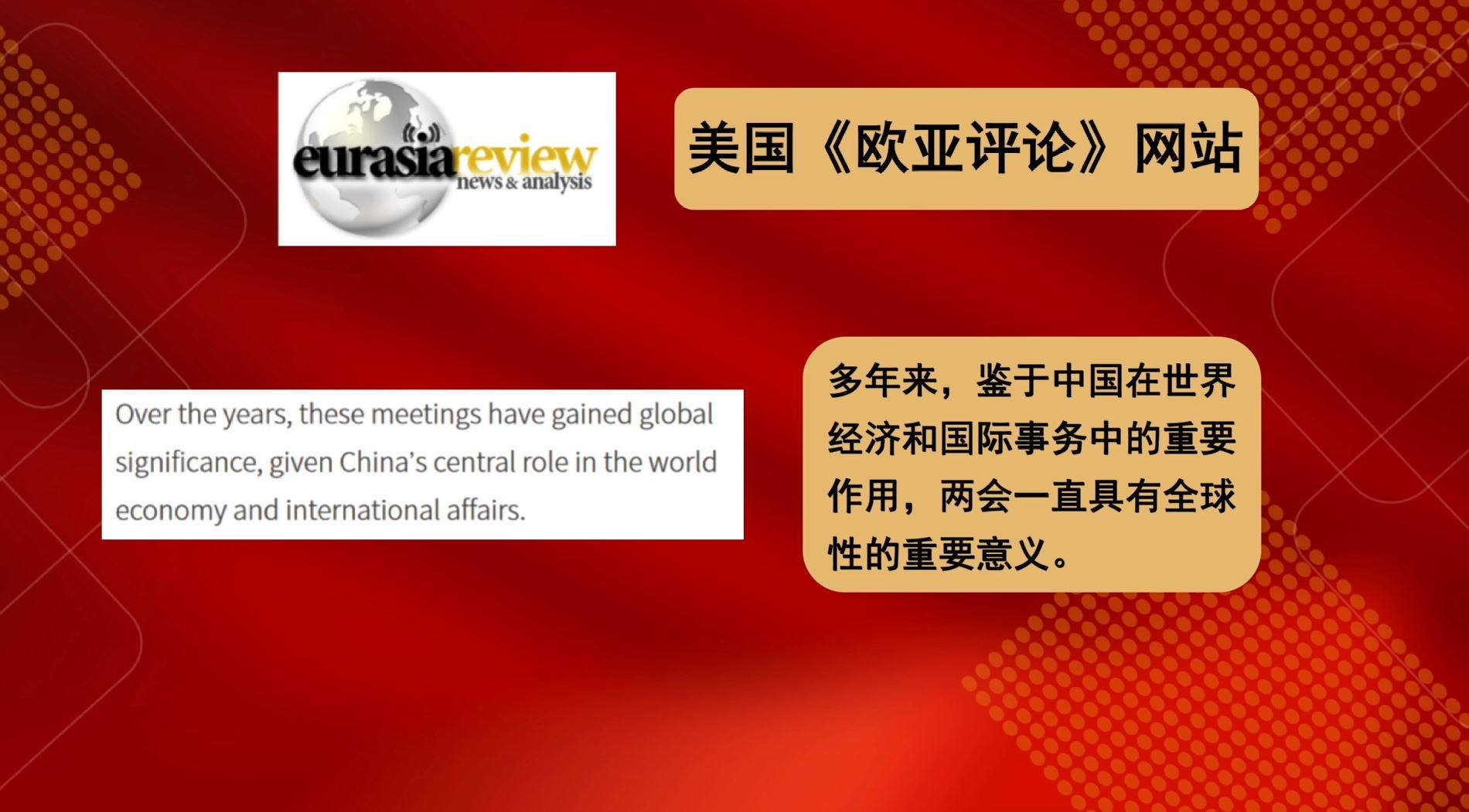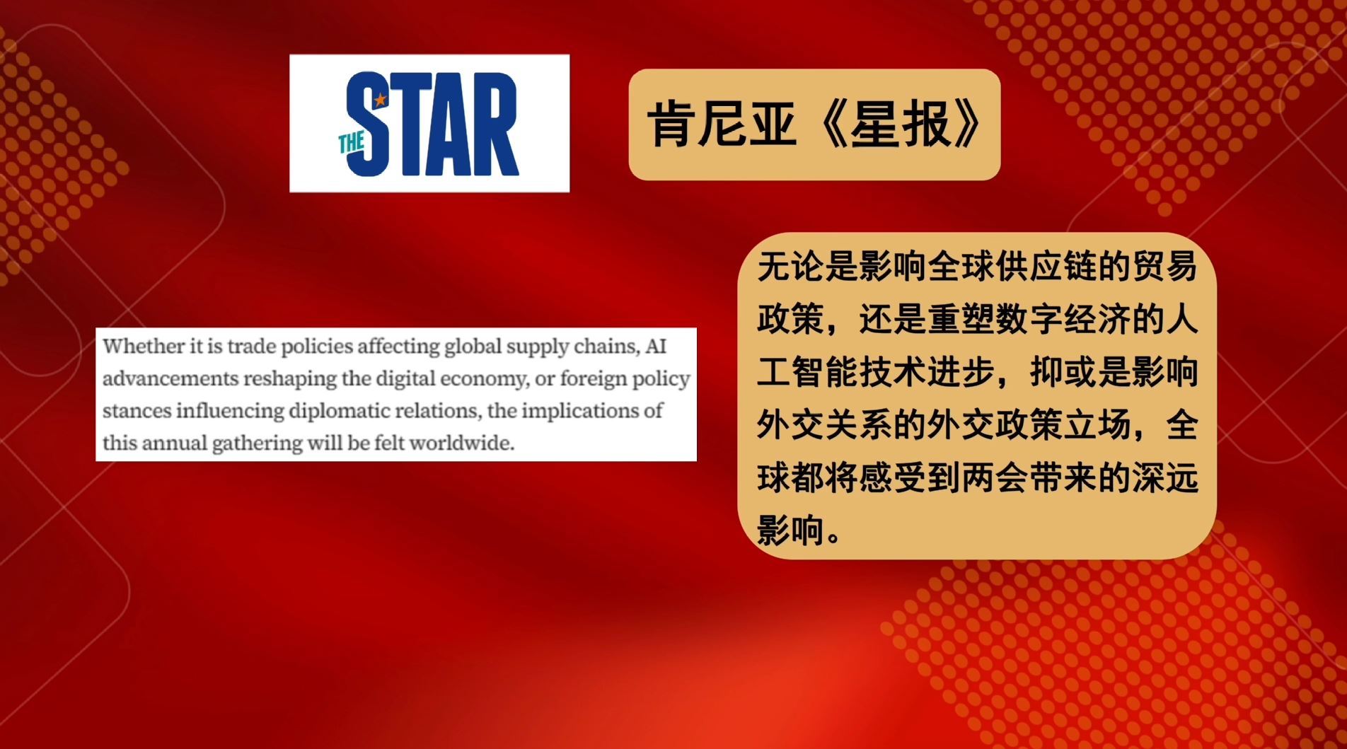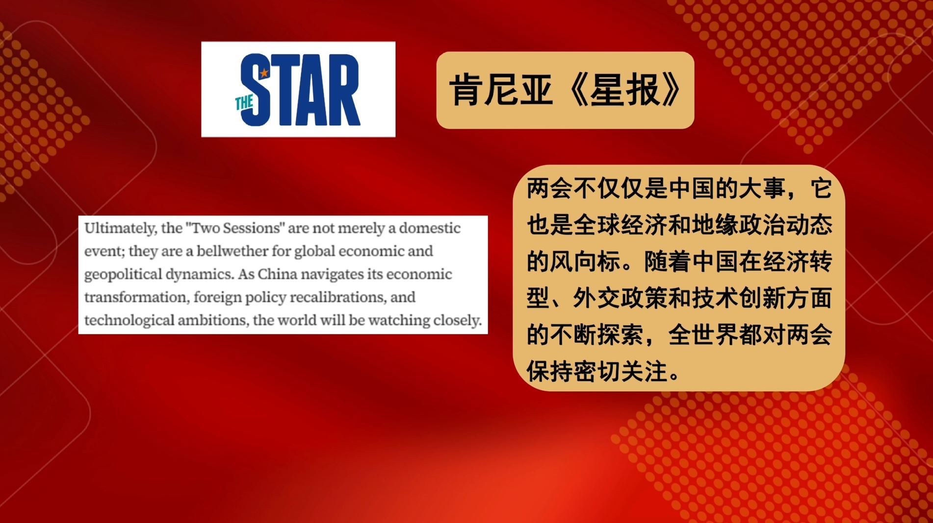 多家外國媒體紛紛用“全球性的重要意義”“直接影響全球市場”“全球的風(fēng)向標(biāo)”“全球感受到兩會的深遠(yuǎn)影響”這些描述,對中國兩會對世界的重要性給予高度肯定。