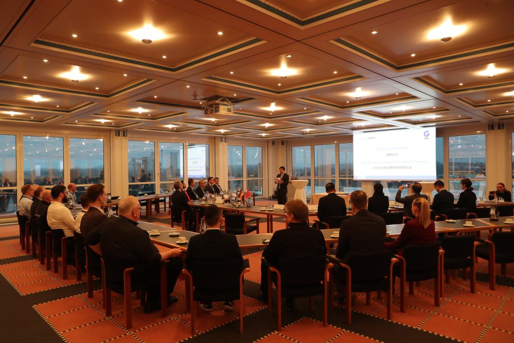 中國(guó)江蘇省太倉(cāng)市2024年1月22日在德國(guó)北威州貝庫(kù)姆市為落戶(hù)的第500家德企伯曼集團(tuán)舉行授牌儀式。新華社記者杜哲宇攝