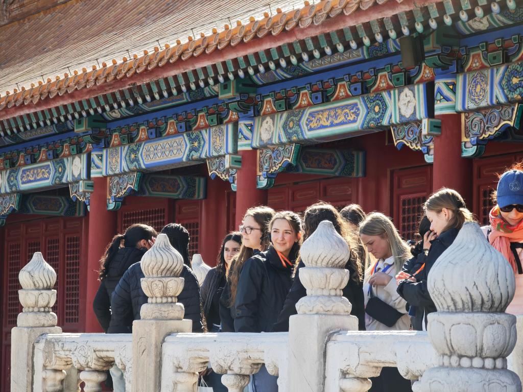 3月18日,美國艾奧瓦州高中生研學團游覽北京故宮。新華社記者 馬卓言 攝