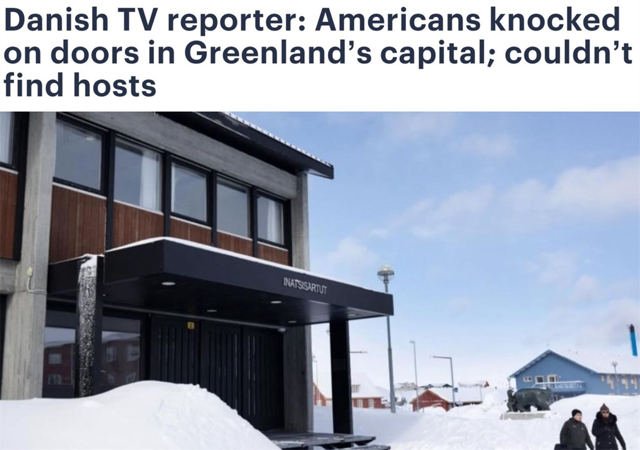 據(jù)丹麥電視二臺(tái)記者賈斯珀·斯坦梅茨在節(jié)目中披露,萬(wàn)斯率領(lǐng)的代表團(tuán)出發(fā)之前,美國(guó)政府已秘密派人到格陵蘭島相關(guān)地區(qū)“做工作”,希望當(dāng)?shù)孛癖姎g迎萬(wàn)斯一行,但卻碰了一鼻子灰。