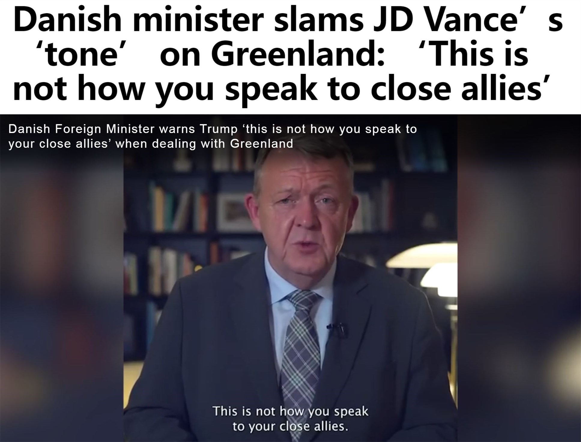 丹麥外交大臣拉斯穆森29日在社交媒體上發(fā)表視頻講話,批評(píng)萬(wàn)斯有關(guān)格陵蘭島表態(tài)的“調(diào)調(diào)”。