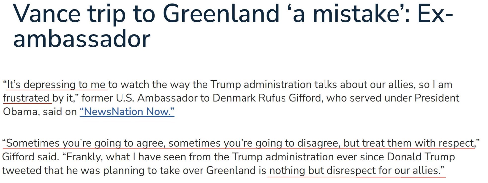 美國(guó)前駐丹麥大使吉福德近日在接受采訪時(shí)也認(rèn)為,美國(guó)政府在格陵蘭島問題上缺乏最起碼的尊重。