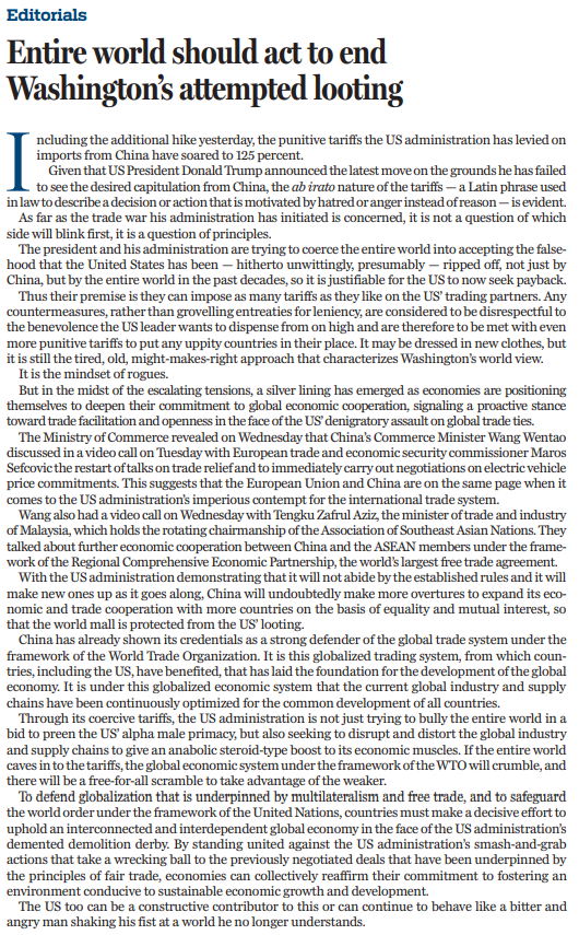 美國(guó)政府試圖脅迫全世界接受這樣一個(gè)謊言,即美國(guó)在過去幾十年中不僅被中國(guó),而且被整個(gè)世界所欺騙,因此美國(guó)現(xiàn)在加征關(guān)稅是理所當(dāng)然的。其他國(guó)家如果不卑躬屈膝地請(qǐng)求“寬大處理”,甚至采取反制措施,就會(huì)被視為對(duì)美方大不敬,美國(guó)將加以更高的懲罰性關(guān)稅,迫使敢于反抗的國(guó)家俯首稱臣。華盛頓的世界觀也許披上了新衣,但仍然是老套的“強(qiáng)權(quán)即公理”,完全是流氓心態(tài)和強(qiáng)盜邏輯。