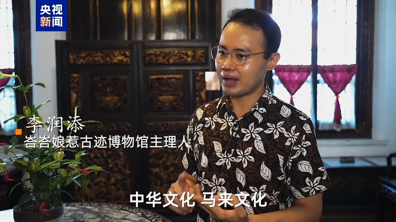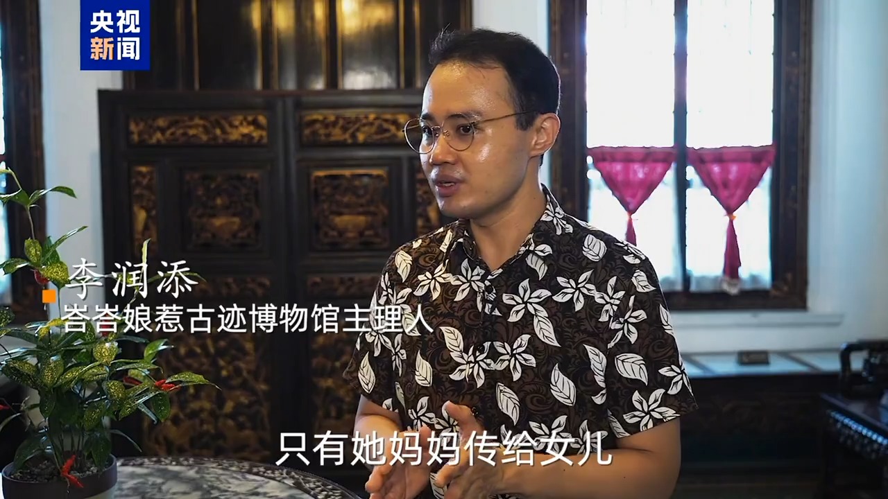 峇峇娘惹古跡博物館主理人 李潤添:所謂的娘惹文化其實(shí)是中華文化、馬來文化以及西方文化的融合。眼看好像是從西方來的椅子,但是你仔細(xì)觀察,它的手扶那邊有龍頭,里邊還含著一粒珠。