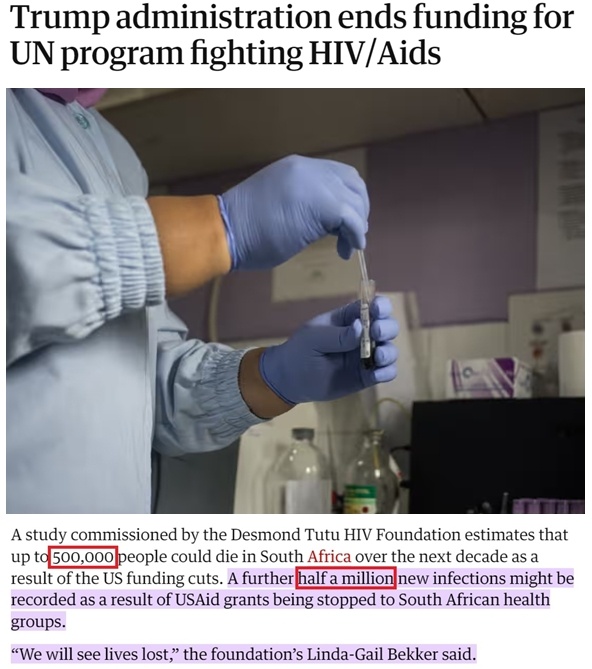 南非德斯蒙德·圖圖艾滋病中心主任琳達-蓋爾·貝克爾告訴記者,美國取消對當?shù)乜拱M織的資助將導(dǎo)致“超過50萬不必要的死亡以及多達50萬新增感染病例”,使有關(guān)方面“過去25年的所有努力付諸東流”。