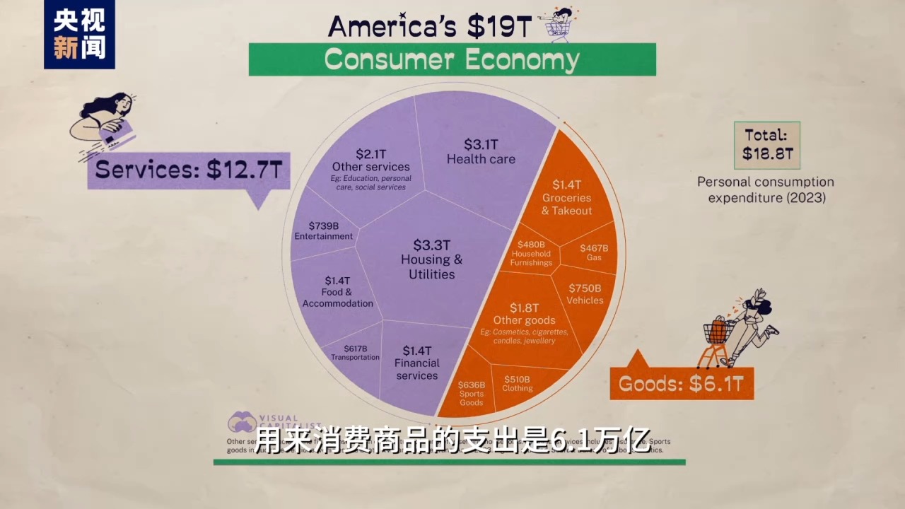 按美國勞動局數(shù)據,美國人2023年消費支出18.8萬億美元,其中12.7萬億花在了看病、租房、交學費、打官司等服務上,用來消費商品的支出是6.1萬億,不到總消費的三分之一。所以吹噓美國消費能力強屬實是個“地獄笑話”,看病花錢多有什么可驕傲的?