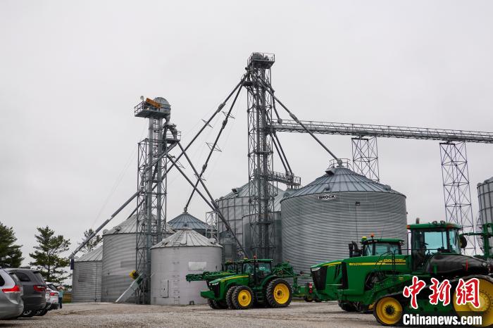 當(dāng)?shù)貢r(shí)間4月25日,在美國(guó)艾奧瓦州首府得梅因市郊的金伯利農(nóng)場(chǎng),多輛拖拉機(jī)停在谷倉附近?!≈行律缬浾?王帆 攝