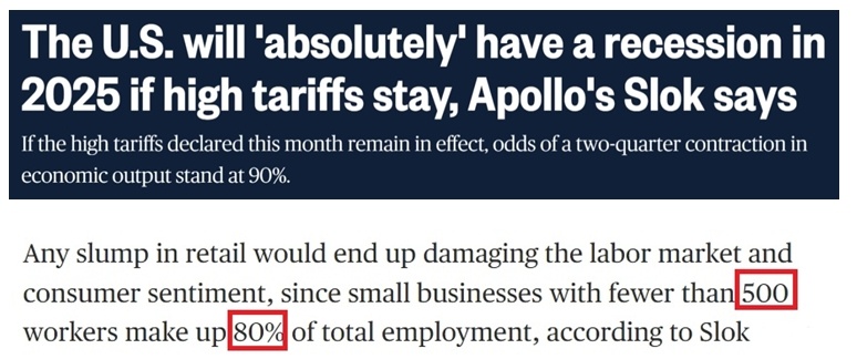 他還警告,如果高關(guān)稅持續(xù)下去,美國(guó)經(jīng)濟(jì)連續(xù)兩個(gè)季度萎縮的可能性將高達(dá)90%,今年年內(nèi)“絕對(duì)”會(huì)陷入衰退。