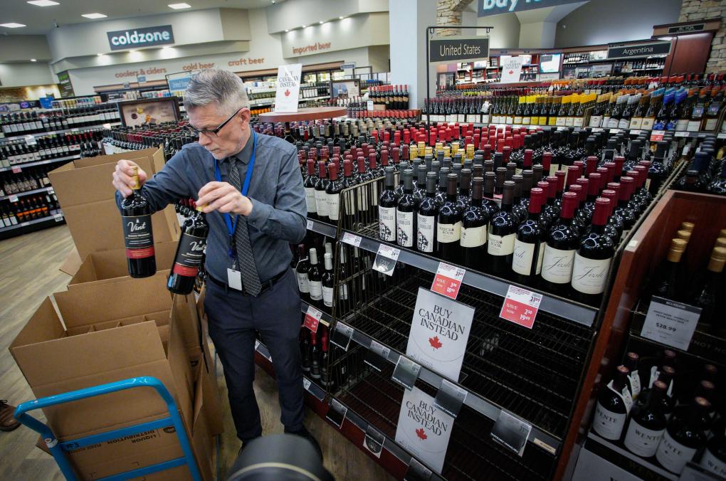 3月10日,在加拿大溫哥華,一家不列顛哥倫比亞省酒類專賣店的店員從貨架上撤下美國(guó)酒類產(chǎn)品。新華社發(fā)(梁森攝)