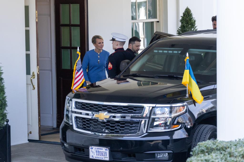 2月28日,烏克蘭總統(tǒng)澤連斯基(左三)離開美國(guó)華盛頓白宮。新華社記者胡友松攝