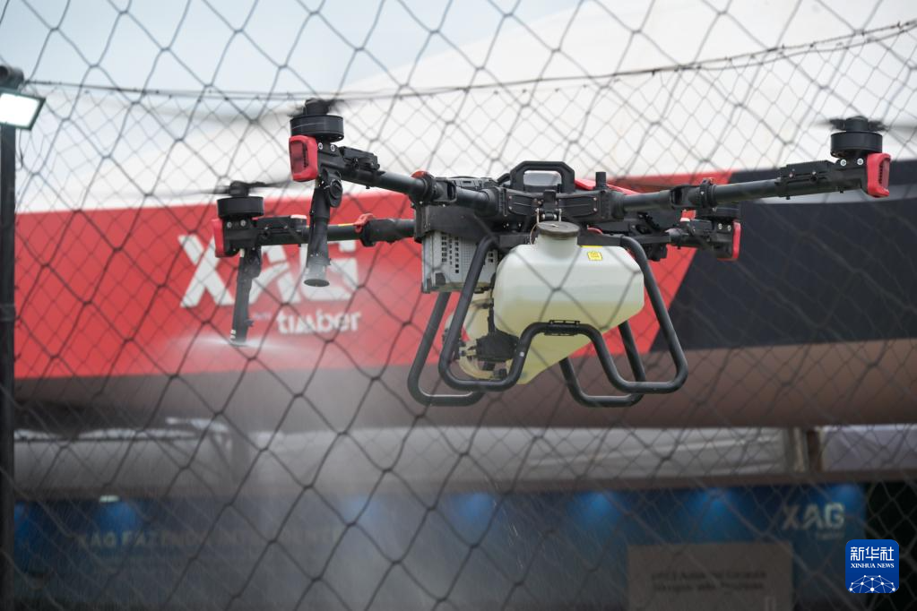 4月29日,在巴西圣保羅州里貝朗普雷圖市舉行的2025年巴西農(nóng)業(yè)科技展上,一架極飛農(nóng)業(yè)無人機進行噴灑演示。新華社記者 陳昊佺 攝