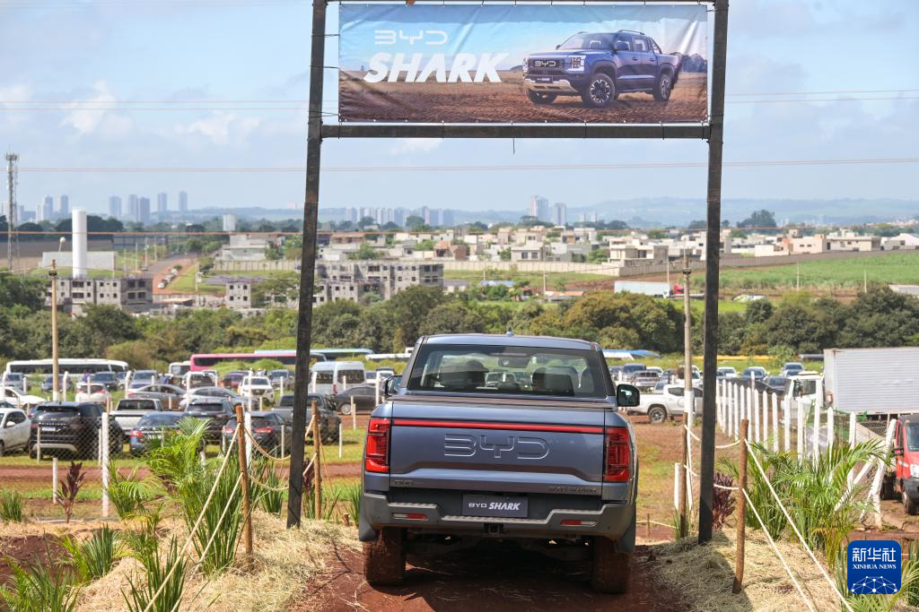 4月29日,在巴西圣保羅州里貝朗普雷圖市舉行的2025年巴西農(nóng)業(yè)科技展上,一輛比亞迪皮卡進行越野演示。新華社記者 陳昊佺 攝