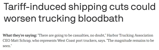 港口卡車運(yùn)輸協(xié)會(huì)首席執(zhí)行官馬特·施拉普表示,關(guān)稅政策若繼續(xù)下去,將嚴(yán)重影響整個(gè)物流行業(yè),“卡車公司將失去業(yè)務(wù),倉(cāng)庫(kù)也沒有存儲(chǔ)業(yè)務(wù),甚至連碼頭裝卸工也沒有那么多工作了”。