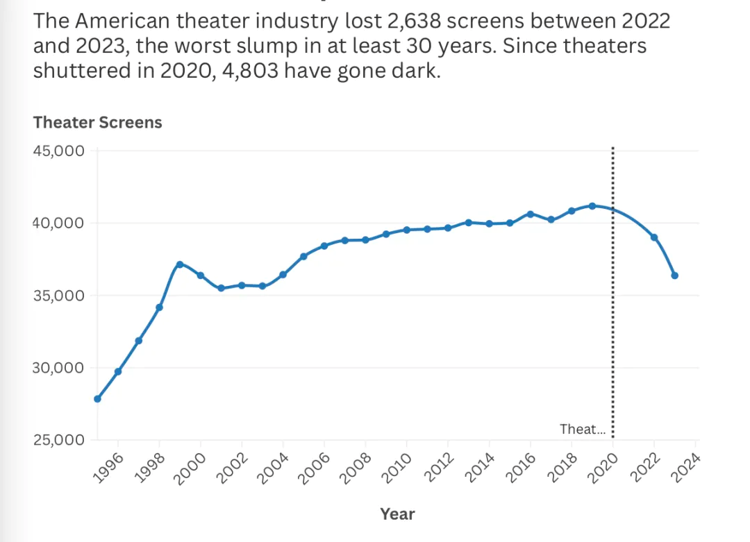 △2022年至2023年間,美國影院損失了2638塊銀幕,這個趨勢還在延續(xù)。