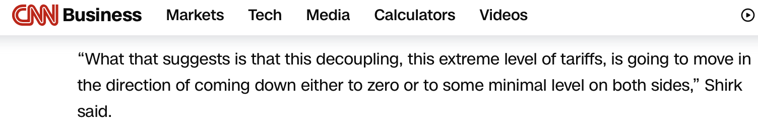 美國有線電視新聞網(wǎng)的報道注意到美國財政部長貝森特此前關(guān)于“本周末的談判將側(cè)重于緩和緊張局勢”的表態(tài)。報道援引加州大學(xué)圣迭戈分校全球政策與戰(zhàn)略學(xué)院研究教授、21世紀中國研究中心名譽主任蘇珊·希爾克的觀點指出,這表明美中之間“脫鉤、極端的關(guān)稅水平,將朝著降至零,或是降至最低水平的方向發(fā)展”。