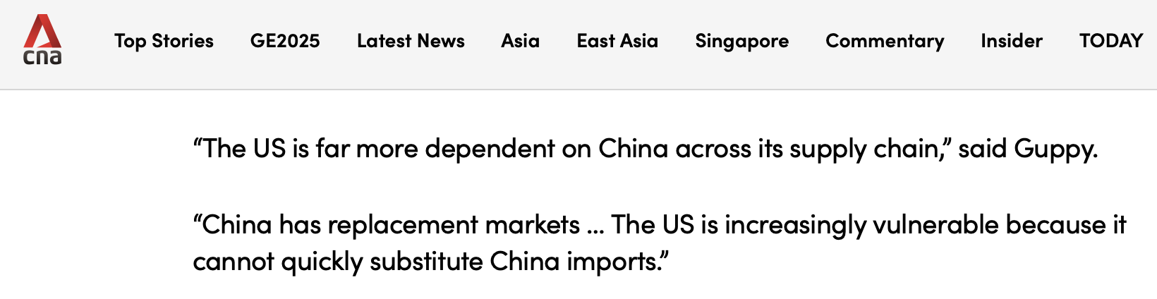 報道稱,澳大利亞金融專欄作家戴若·顧比表示,“美國整個供應(yīng)鏈對中國的依賴程度要高得多”,“中國有替代市場……美國則越來越脆弱,因為它無法迅速找到中國進口產(chǎn)品的替代品”。
