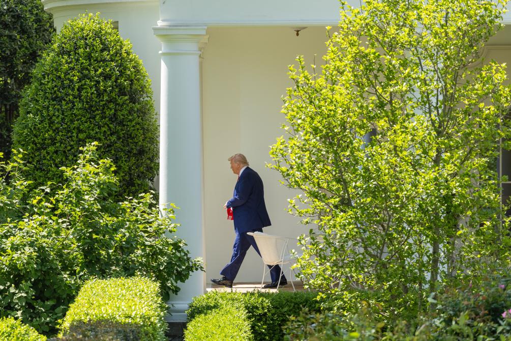 4月29日,在華盛頓白宮,美國總統(tǒng)特朗普走向南草坪準(zhǔn)備登機。新華社記者胡友松攝