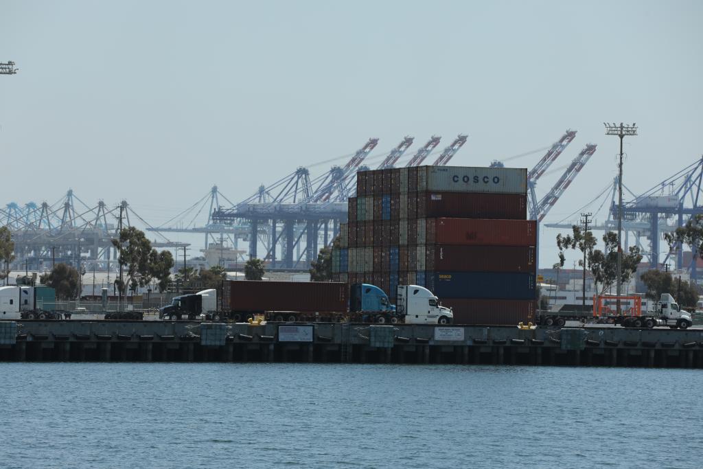 這是4月29日在美國洛杉磯港拍攝的集裝箱和卡車。洛杉磯港執(zhí)行董事吉恩·塞羅卡當(dāng)天表示,隨著美國關(guān)稅政策導(dǎo)致企業(yè)削減進(jìn)口訂單,洛杉磯港下周入境貨運量預(yù)計將比去年同期下跌超過35%。新華社發(fā)(邱晨攝)