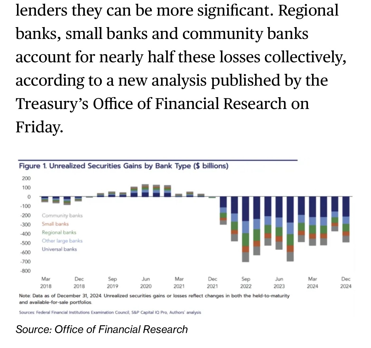 根據(jù)美國聯(lián)邦存款保險公司的最新季度數(shù)據(jù),2024年第四季度,美國銀行債券持有的“未實現(xiàn)損失”總額進一步擴大,達到4820億美元,自9月底以來增加了1180億美元。而根據(jù)美國財政部金融研究辦公室此前發(fā)布的一份報告,地區(qū)性銀行、小型銀行和社區(qū)銀行共同承擔了這些損失的近一半。