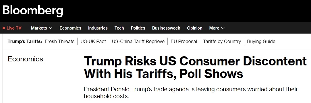 彭博社近日民調(diào)顯示,56%的受訪美國(guó)人認(rèn)為,特朗普對(duì)其他國(guó)家征收的關(guān)稅對(duì)他們的家庭財(cái)務(wù)狀況產(chǎn)生了不良影響。即使特朗普政府一直在鼓吹加關(guān)稅能讓產(chǎn)業(yè)回流美國(guó)并增加財(cái)政收入,約52%的受訪者還是表示,美政府承諾的好處不值得他們?yōu)榇烁冻龅慕?jīng)濟(jì)代價(jià)。