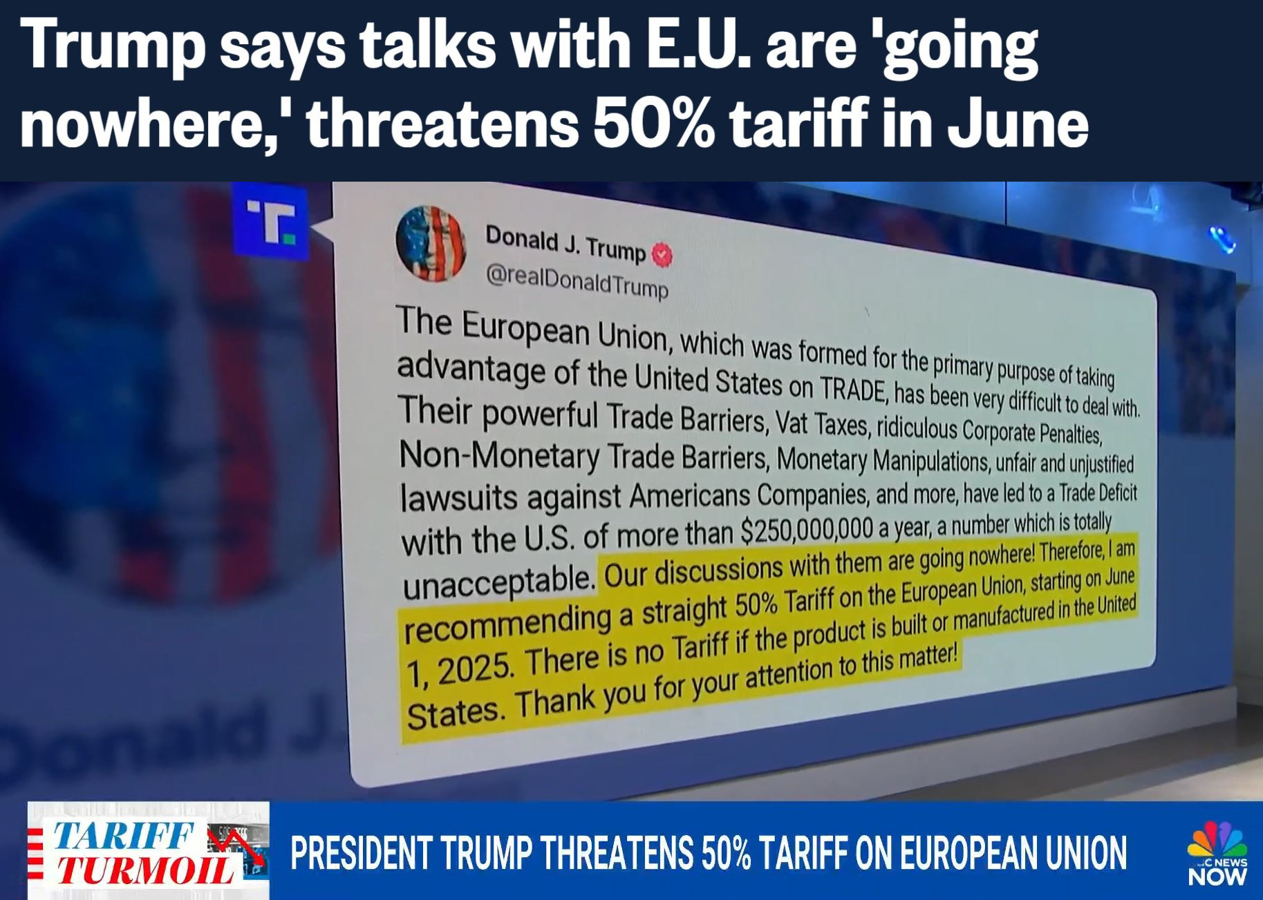 美國總統(tǒng)特朗普23日在社交媒體發(fā)文威脅稱,由于美國與歐盟的談判“毫無進(jìn)展”,他建議從6月1日起對(duì)來自歐盟的商品征收50%的關(guān)稅。